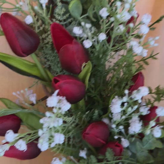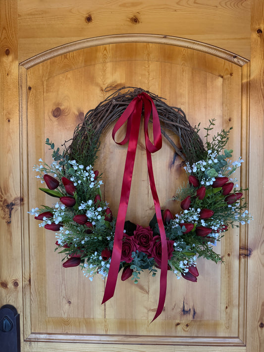 Custom Real Touch Red Rose & Tulip Wreath with Red Satin Ribbon