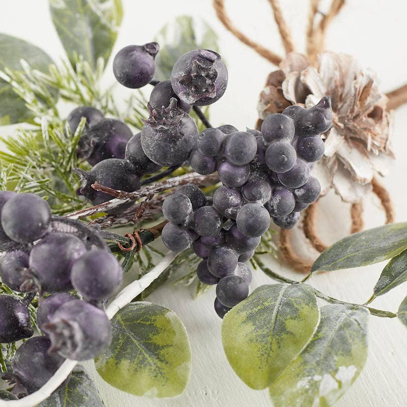 This Artificial Blueberry and Pinecone Floral Pick—a great accent for holiday decor! Perfect for Christmas arrangements, wreaths, and decorations, the picks bring a rustic touch. The pick has faux blueberries, sprigs of pine, and variegated leaves, all accented with a natural jute bow tied around the brown hand wrapped wire stem. Whether used in centerpieces, garlands, or seasonal displays, it will work well in a variety of holiday creations. Size: 14 inches (from bottom of stem to tallest part) Price is for 1 stem