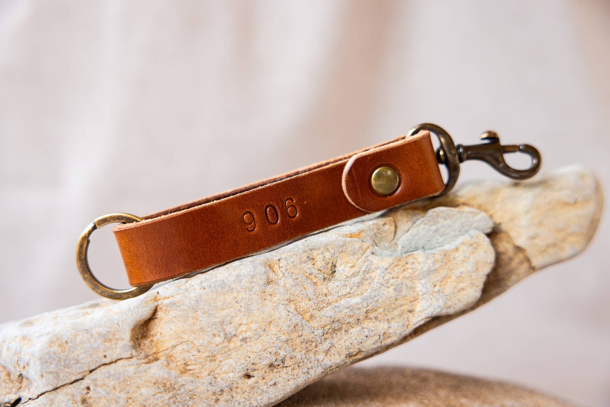 Hand stamped 906 leather key ring & clasp has it all! Made in our traditional buck brown leather and antique brass hardware.