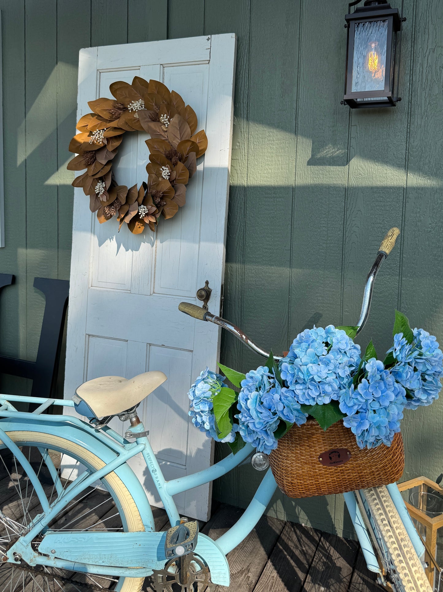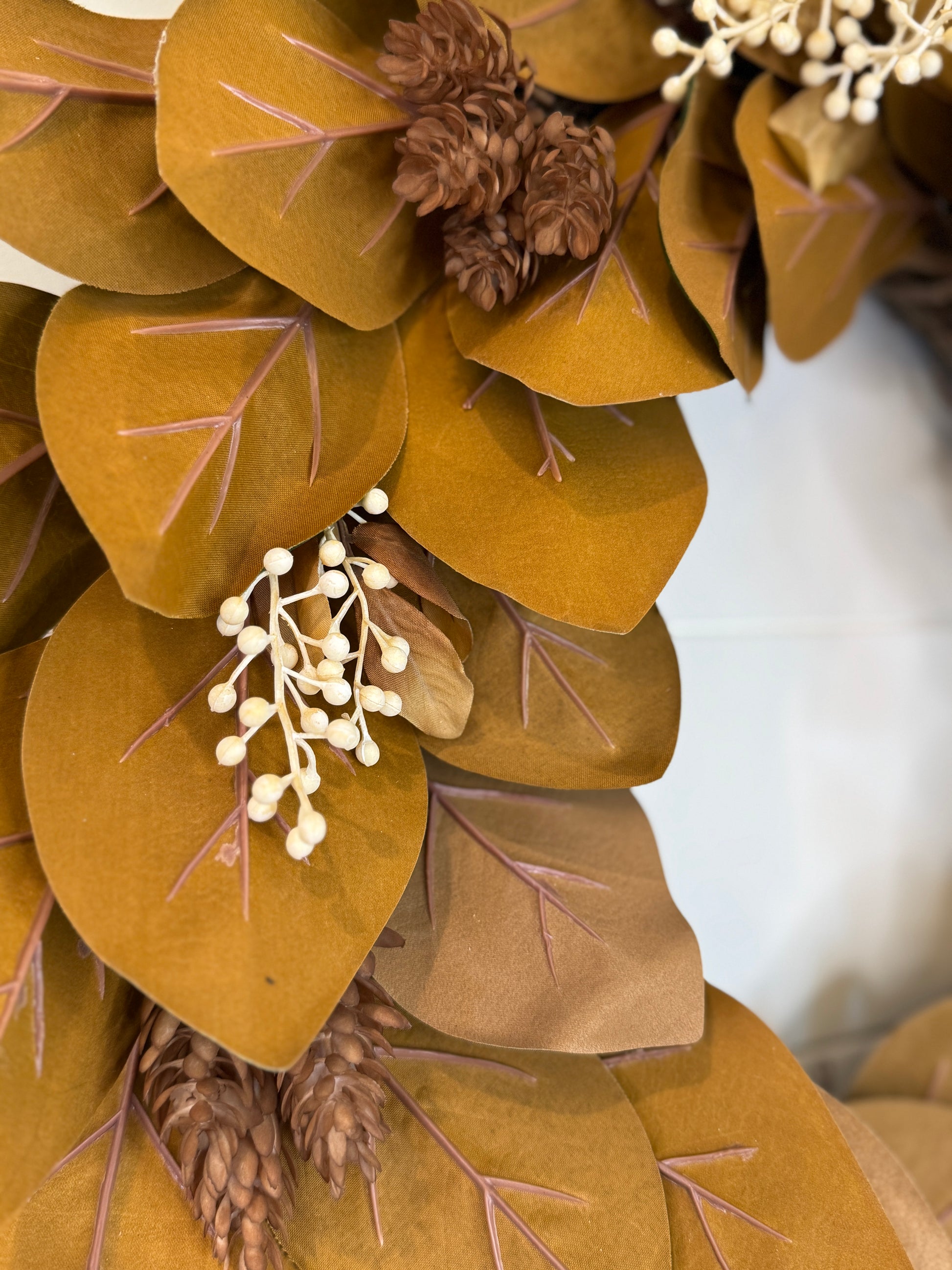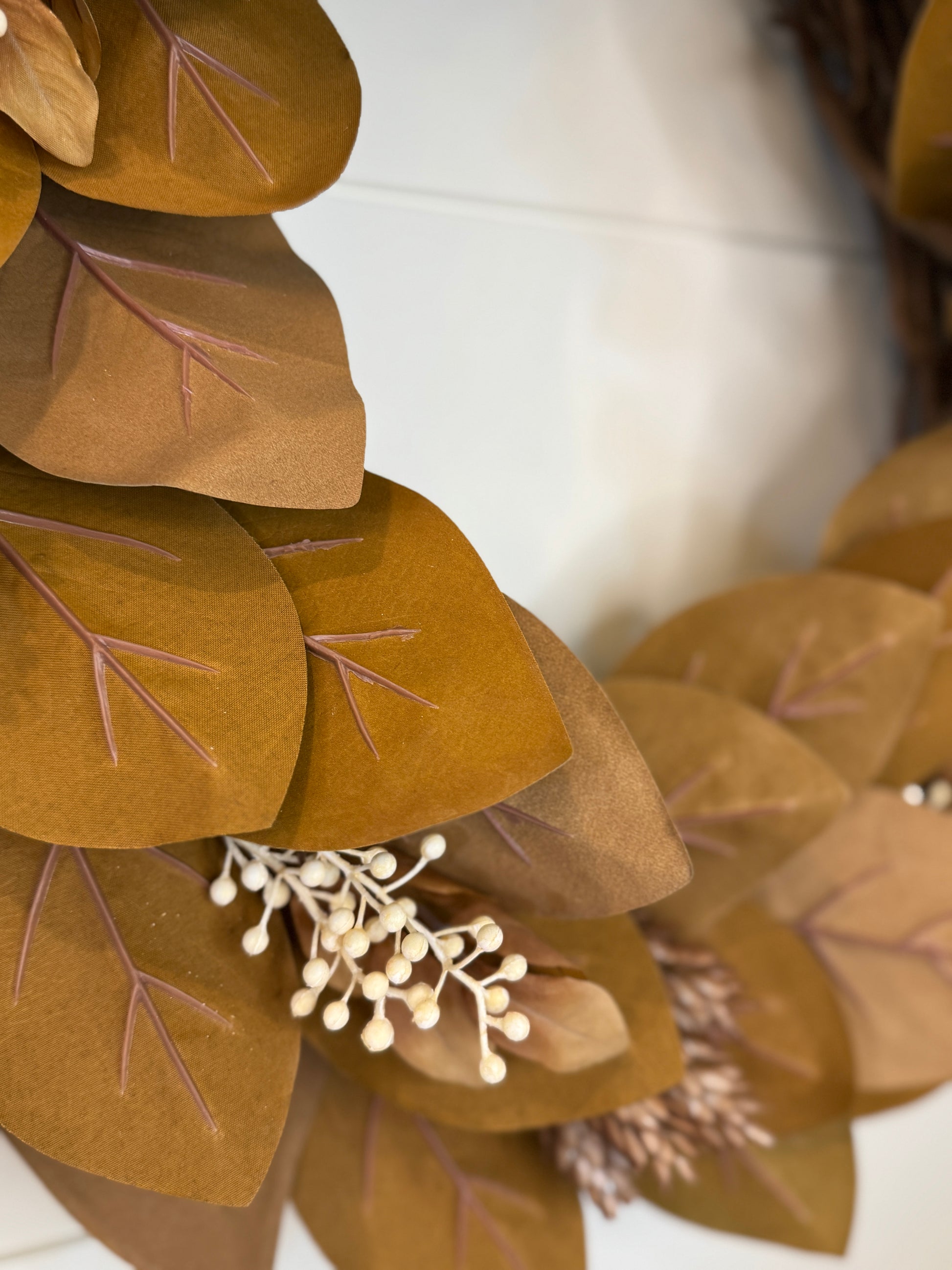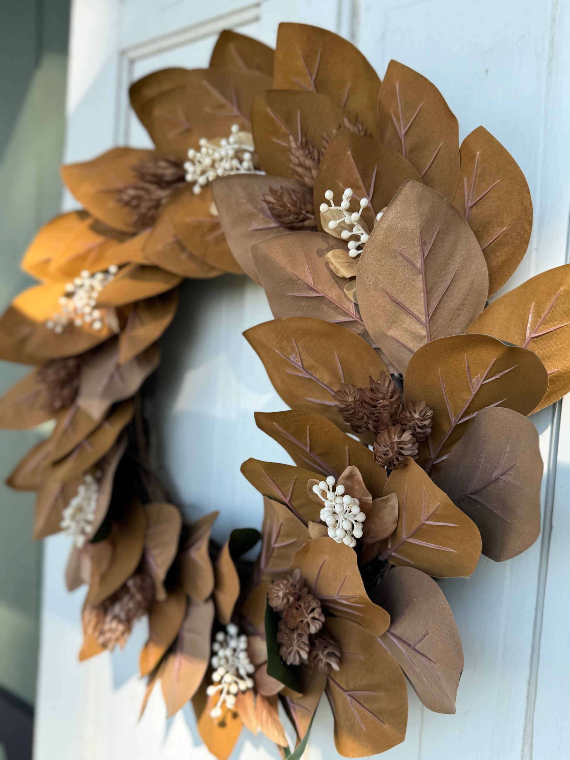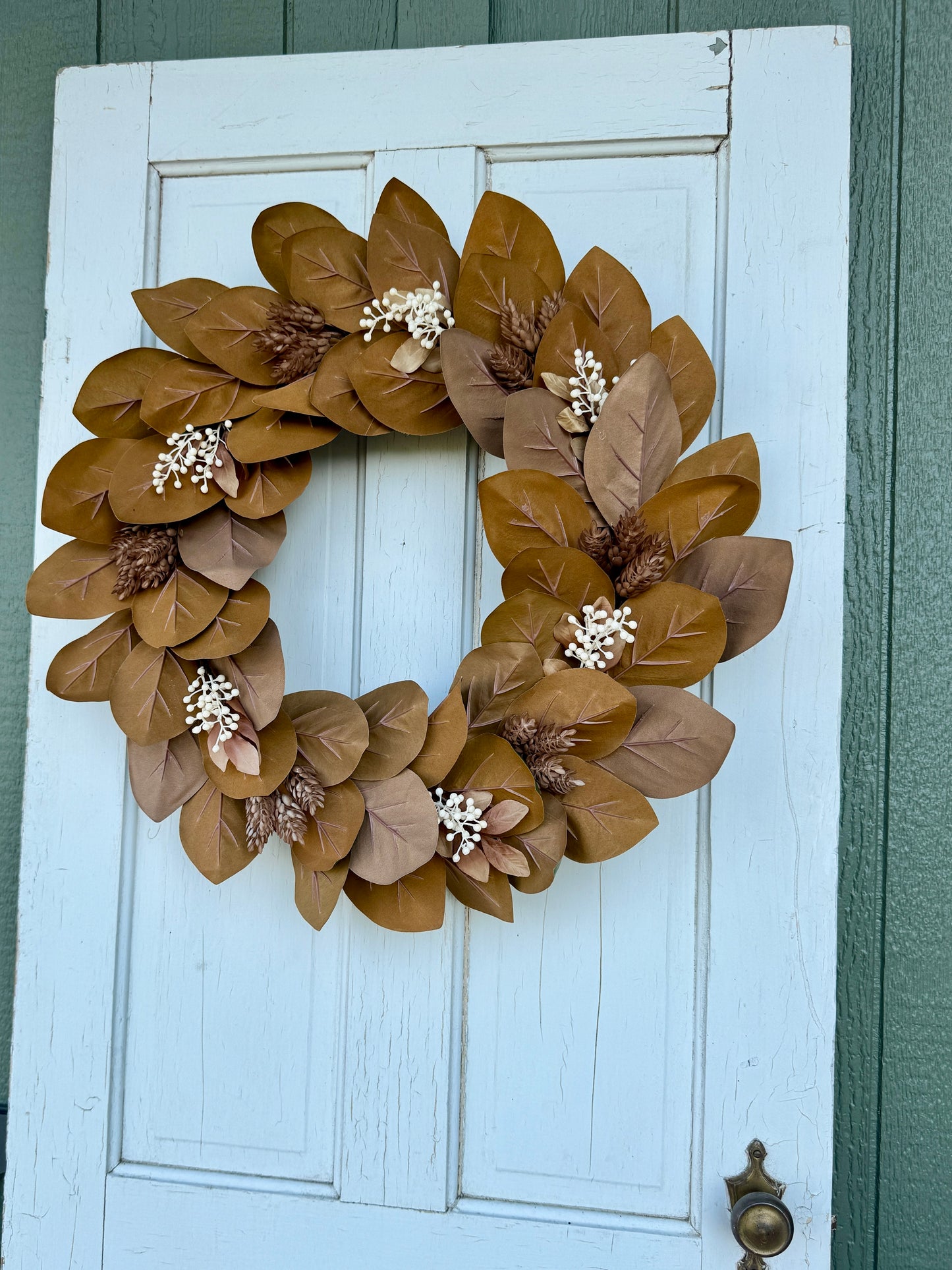 This neutral autumn Front Door Wreath is 25" in diameter, shown on a 30" door. It's made of brown magnolia leaves, hops and beige fall berries. Nothing says "Welcome" like a gorgeous seasonal wreath on your front door or in your entryway. Give this beautiful decor as a gift to the person who has everything!