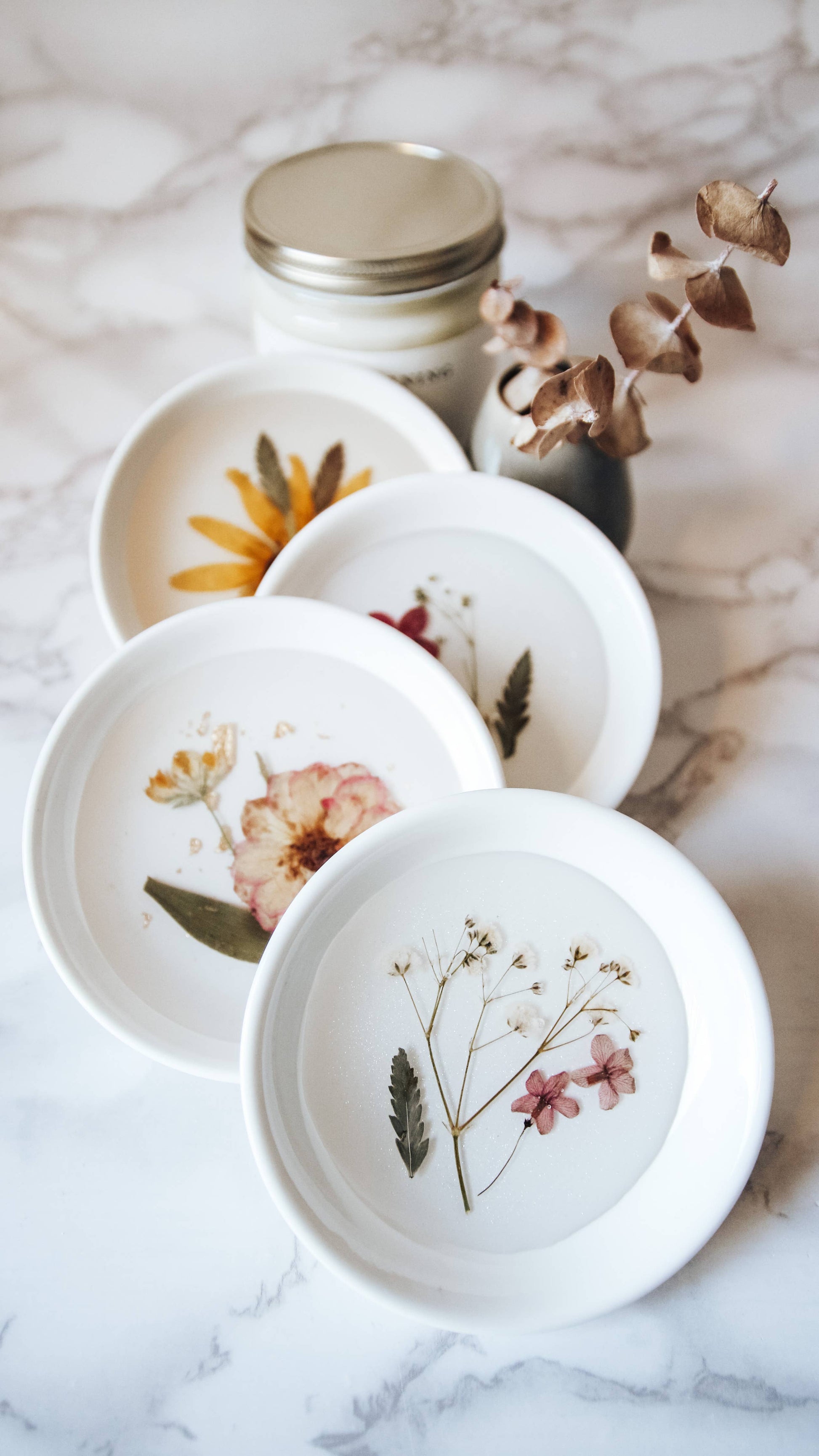 These dishes are great for decorating a vanity or desk! Each dish contains a variety of REAL pressed flowers and botanicals.