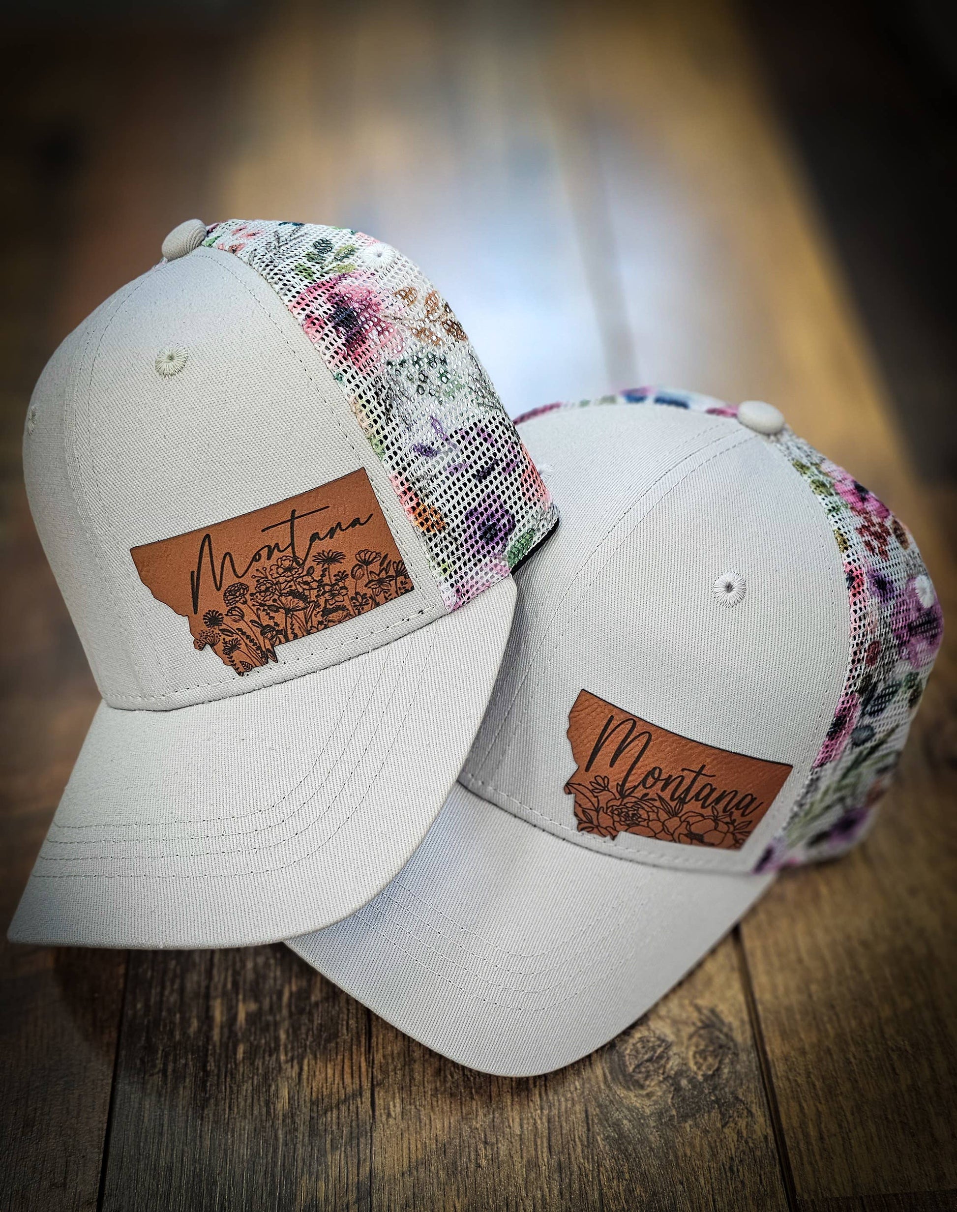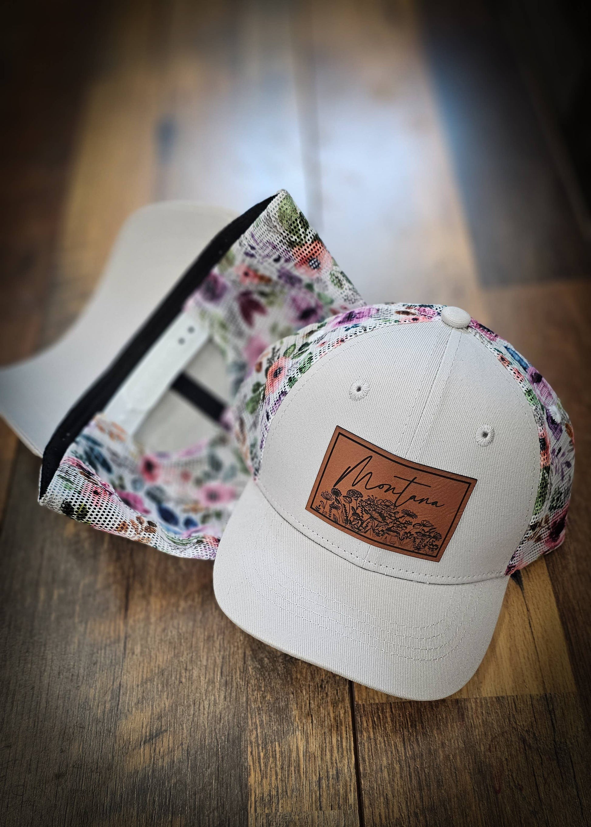 Laser engraves vegan leather patch applied to light gray front, wild floral mesh snapback hat.
