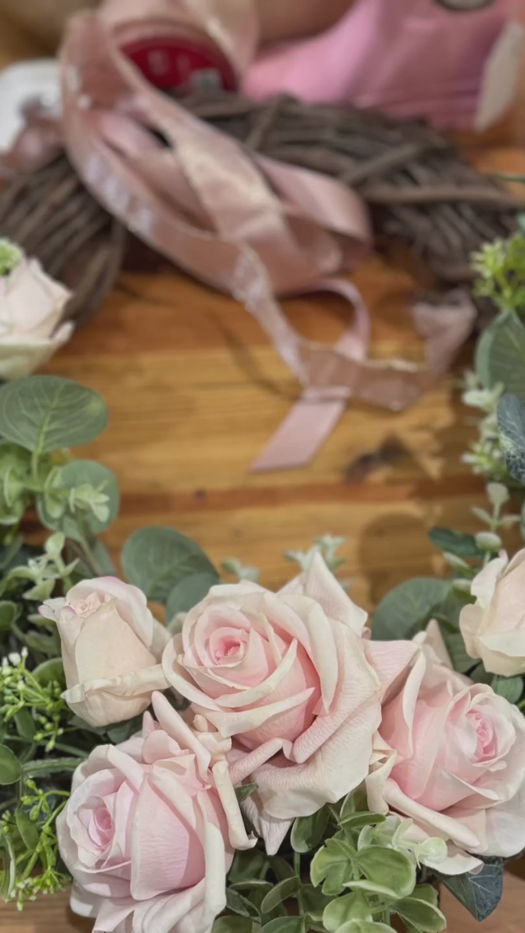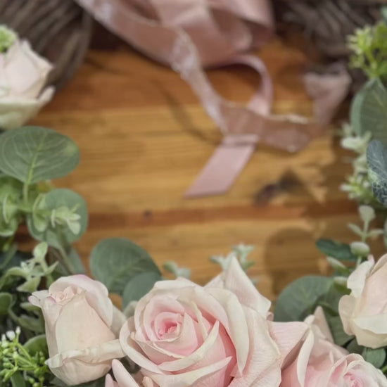 Custom Real Touch Pink Rose & Rosebud Wreath/Pink Satin Bow
