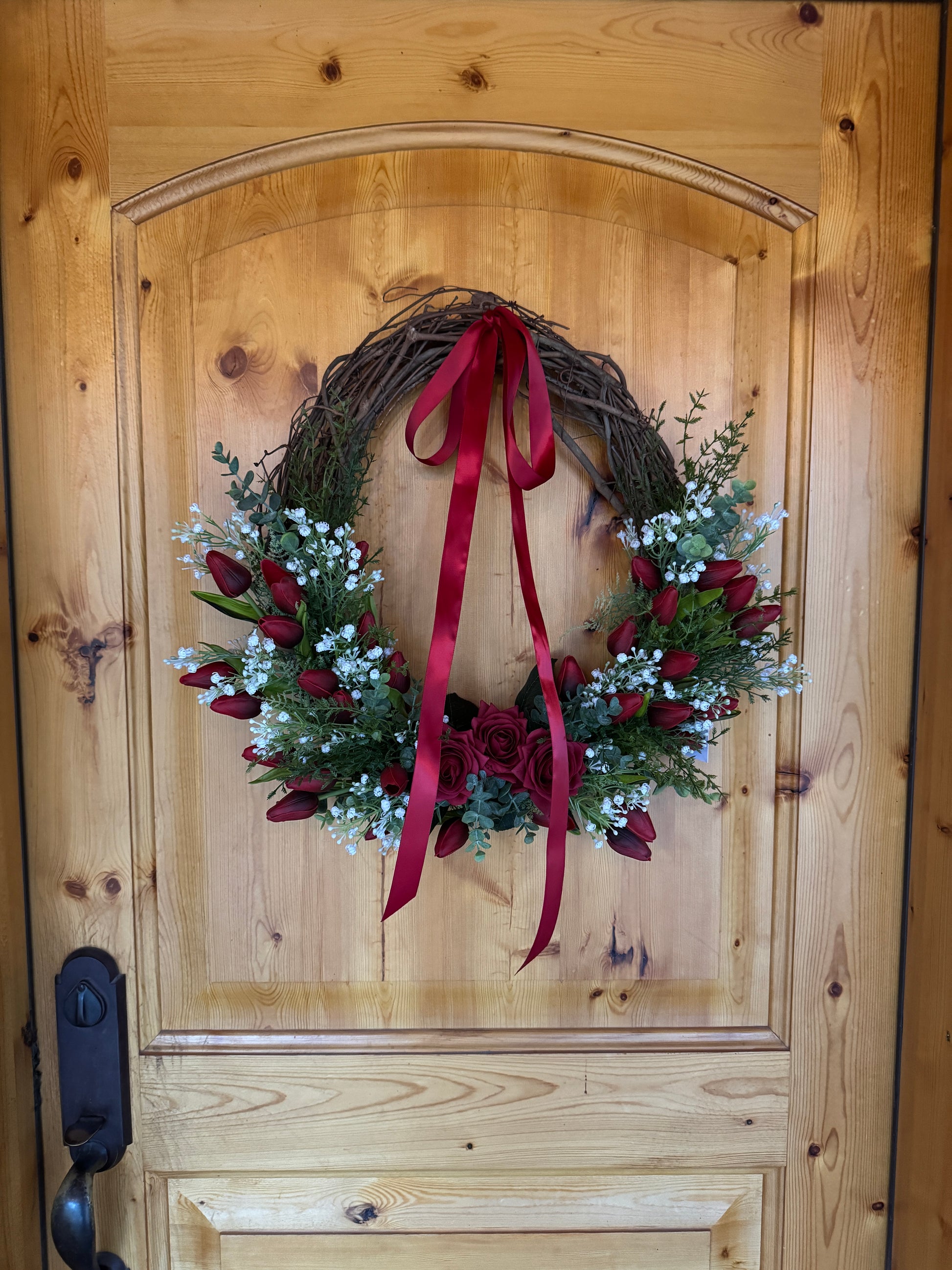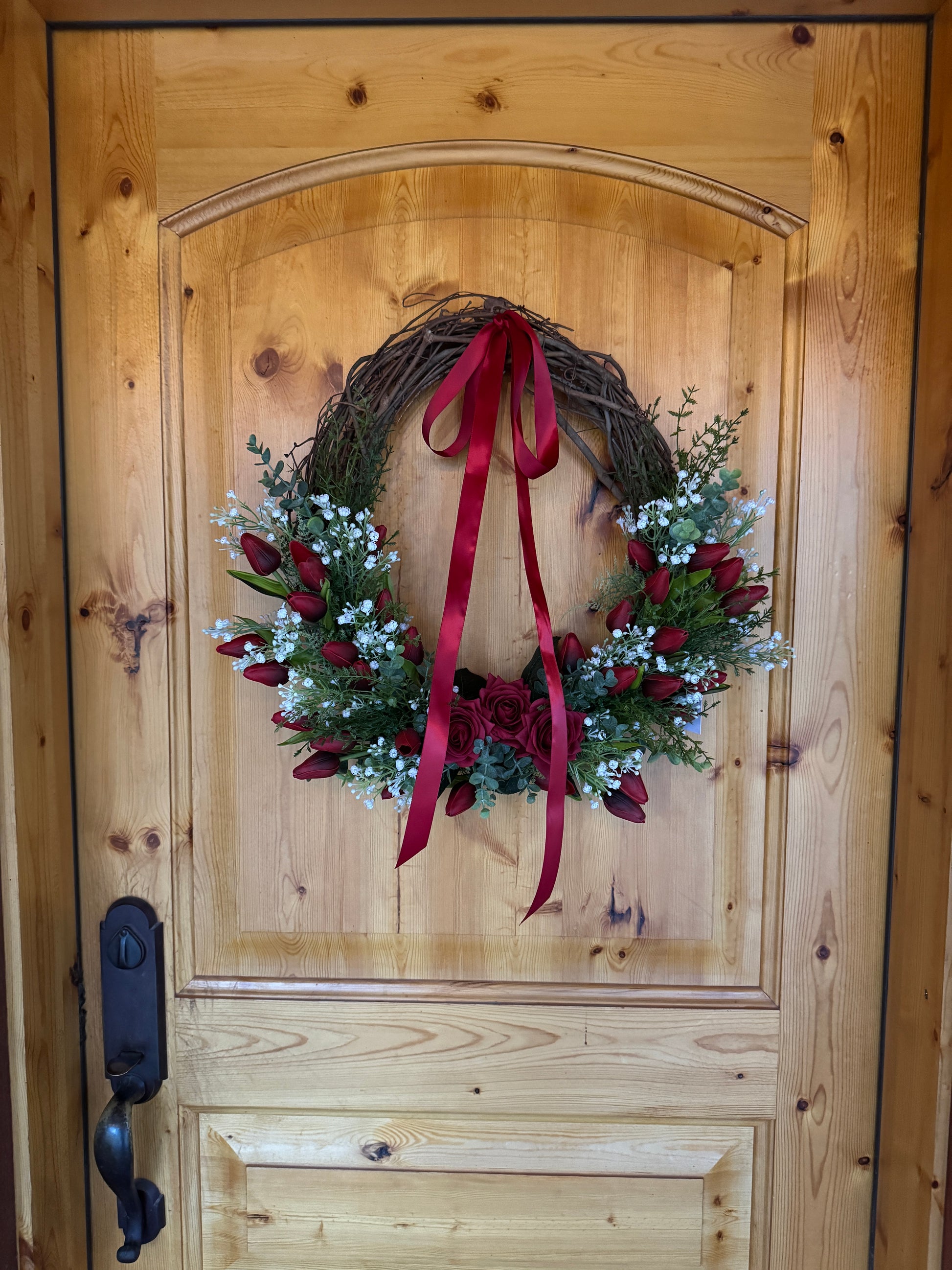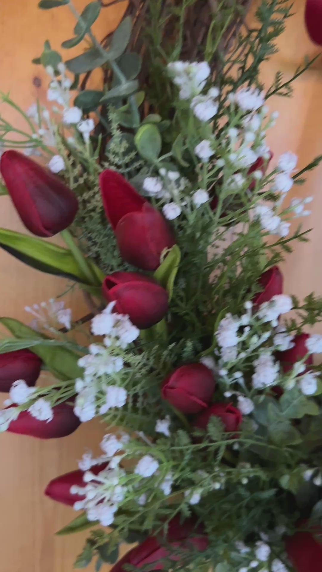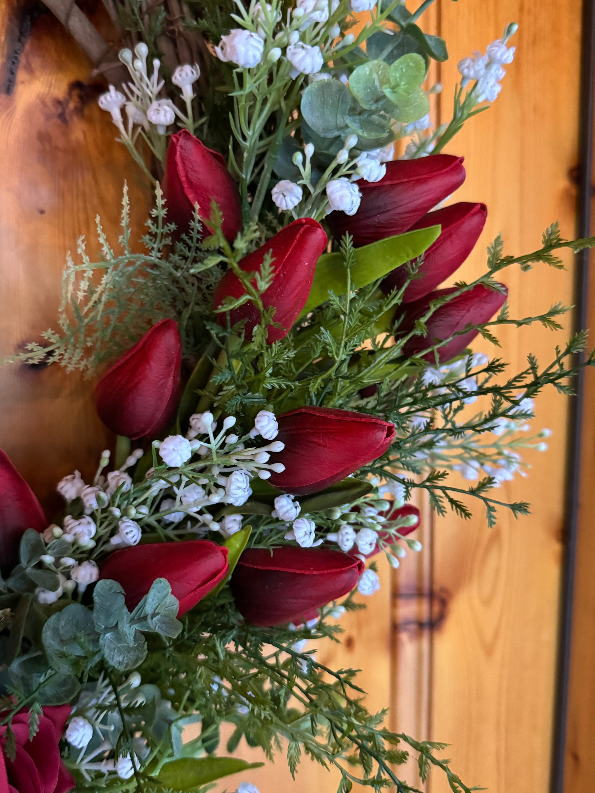 Let these gorgeous red roses, tulips and babies breath brighten your front door! They look and feel real and will greet your guests with something to smile about!
