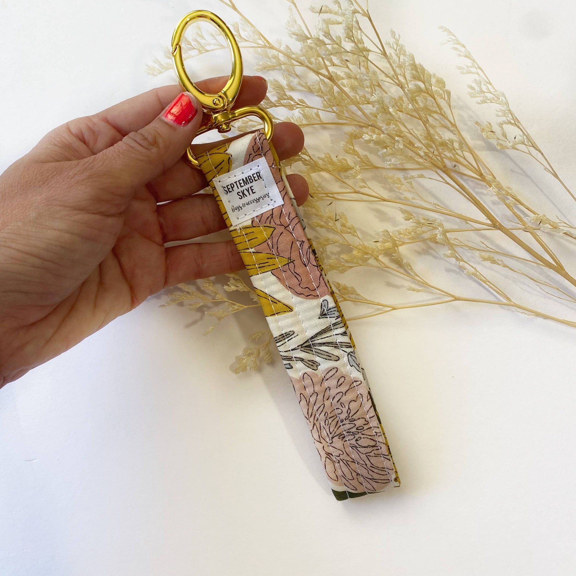 Fabric key fob in beautiful rifle paper prints. Can work as a keychain or wrist strap for a clutch or coin purse