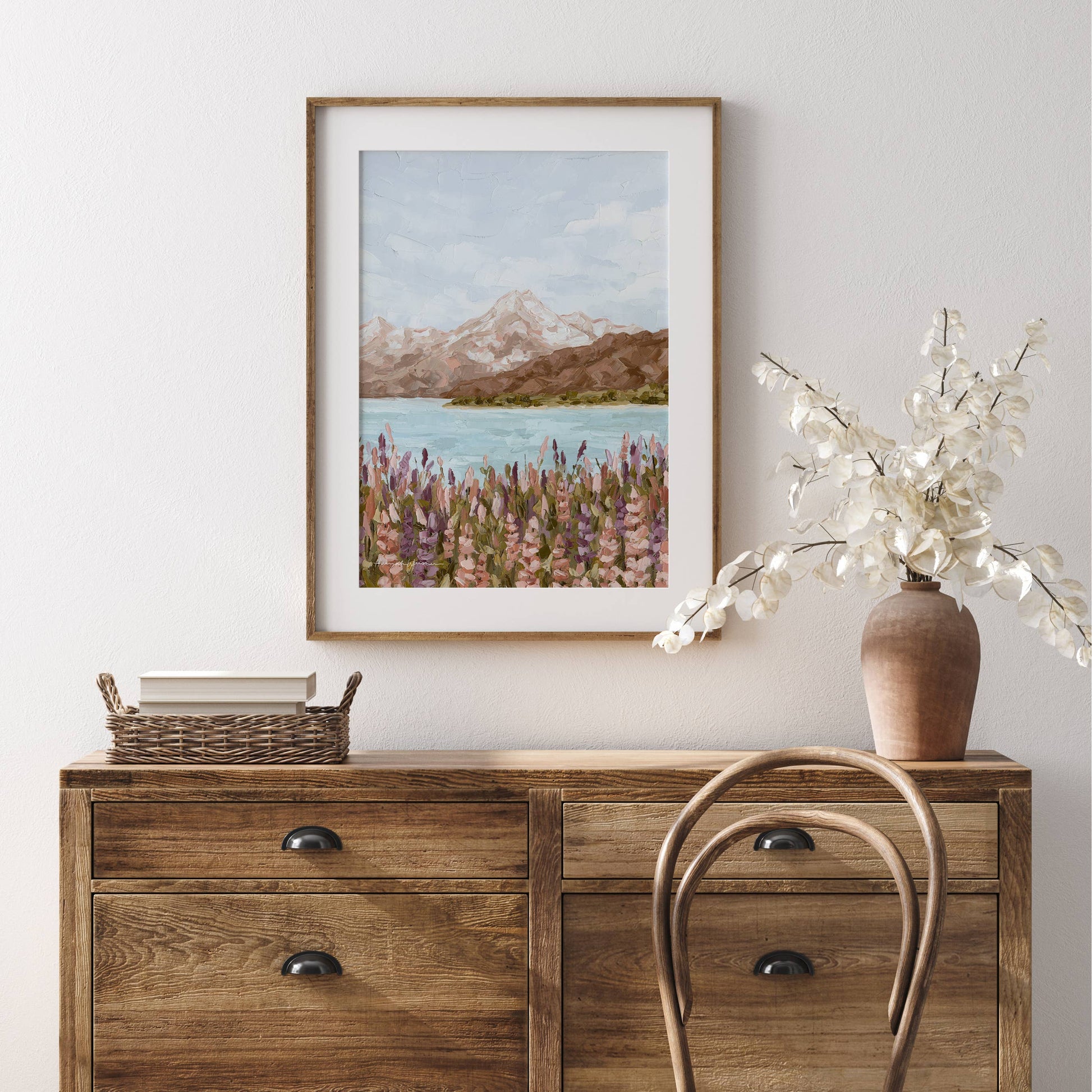 This piece is of wild lupins on the edge of Lake Pukaki, with Mount Cook in the background. This piece of art is printed on high-quality, matte paper with archival inks. Print may be cropped slightly depending on size chosen.