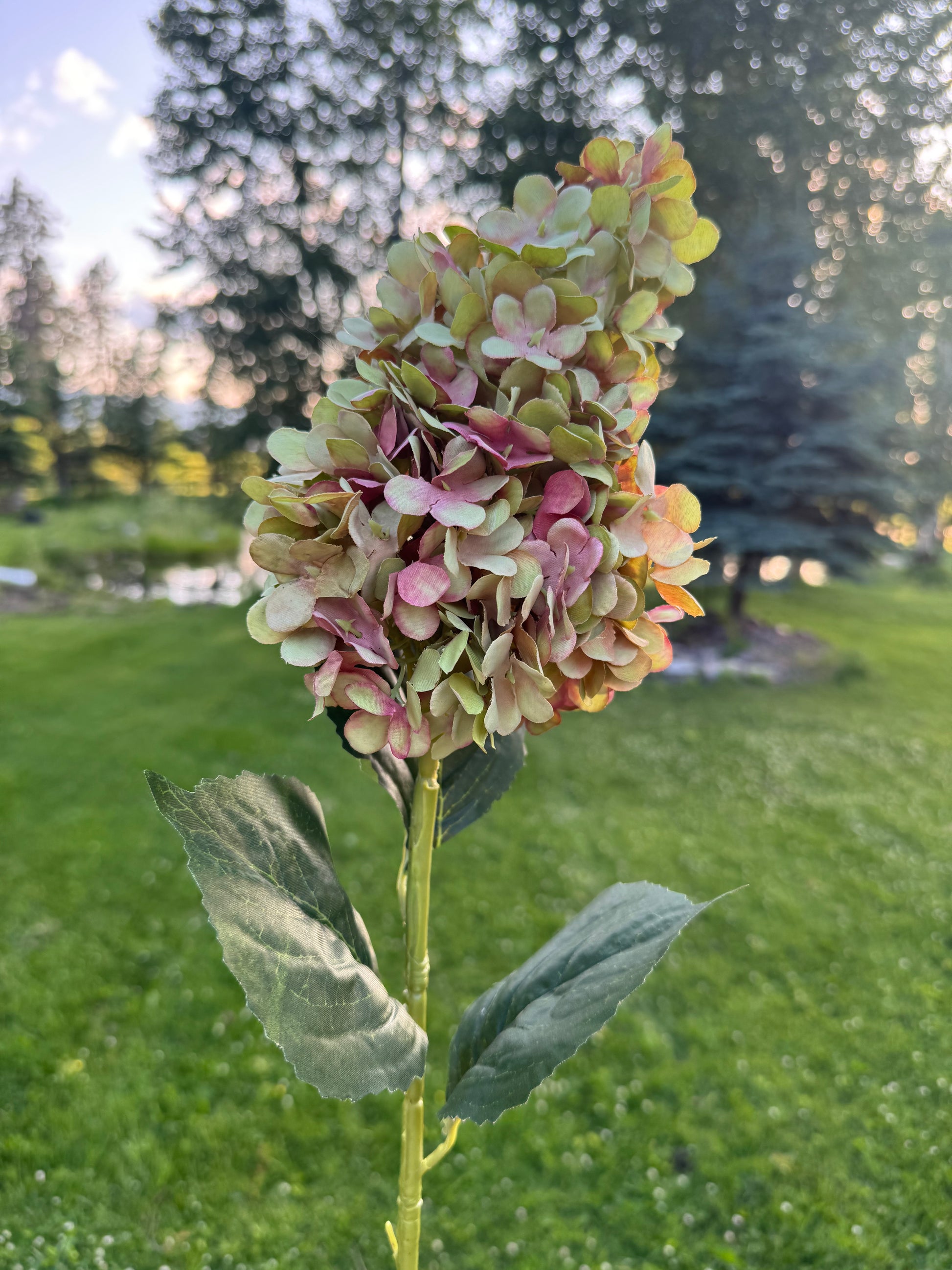 These gorgeous long stem (approx. 30") panicle or cone hydrangeas are stunning! Made of silk and plastic, they will add beauty and charm wherever you choose to place them.