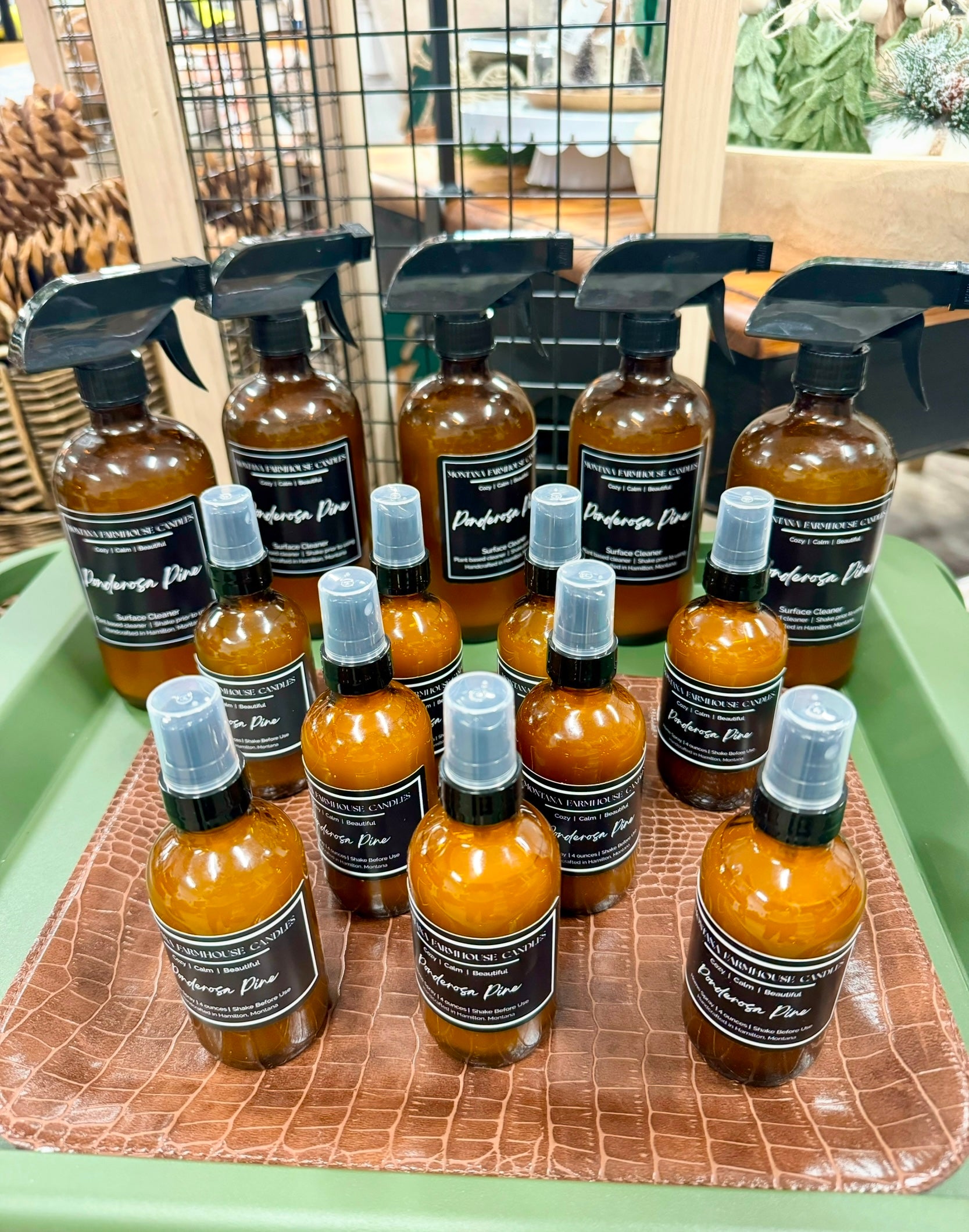 Sixteen ounces of spray in a glass bottle with a spray top. Ponderosa Pine comes in an amber colored bottle with a black spray top and a black label.