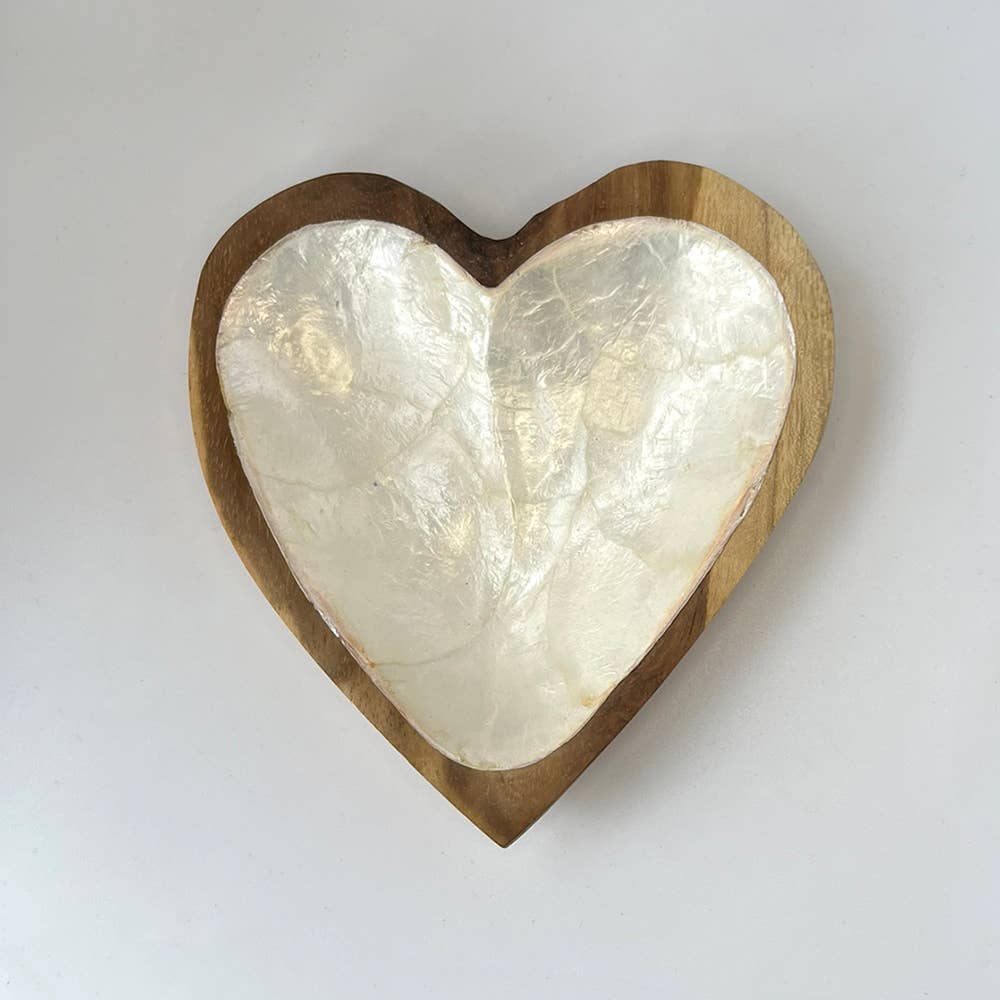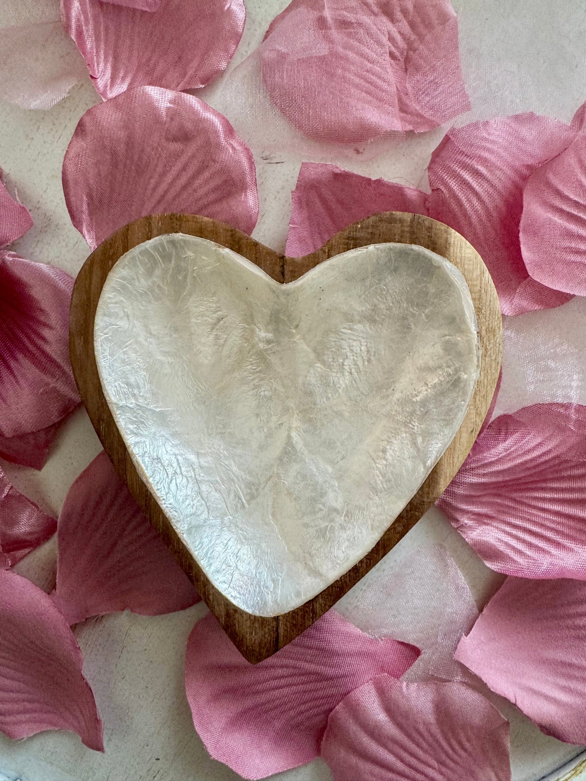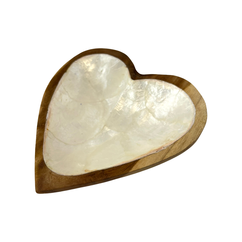 Gorgeous Heart Trinket Dish, crafted from high-quality teak wood and enhanced with a shimmering abalone inlay.