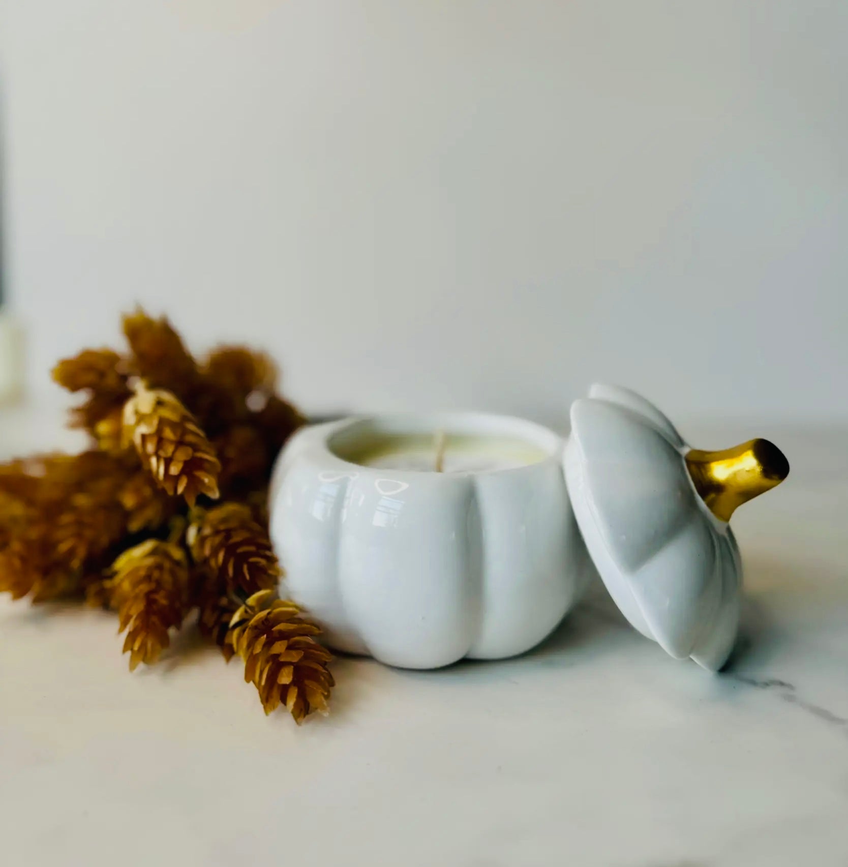 Approx 8 oz. hand poured soy candle in a white pumpkin with lid. Burn time is approx 30 hours.